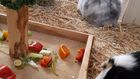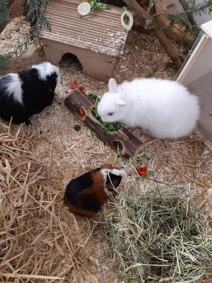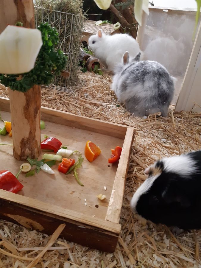 Die Fütterung erfolgt zweimal täglich mit frischem Obst, Gemüse, Heu und im Sommer mit frischem Gras oder nach Kundenwunsch.