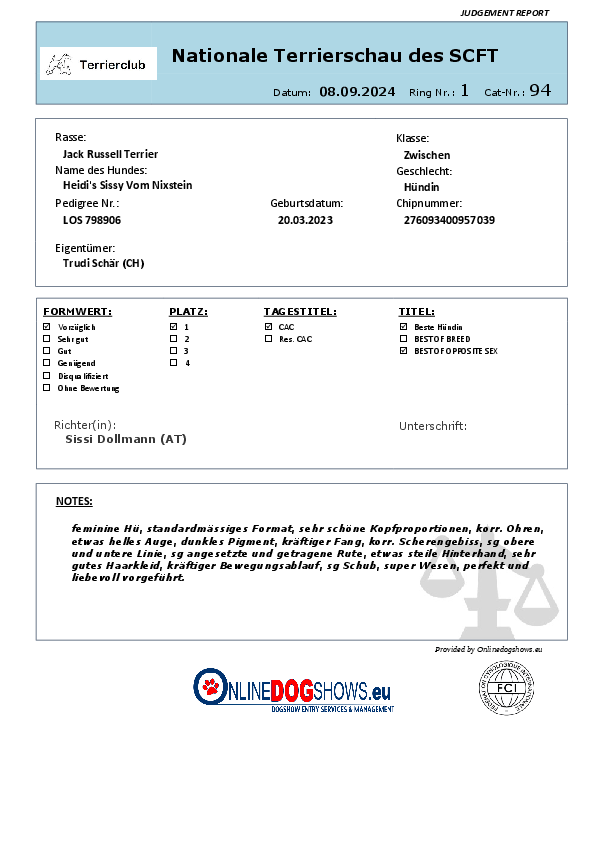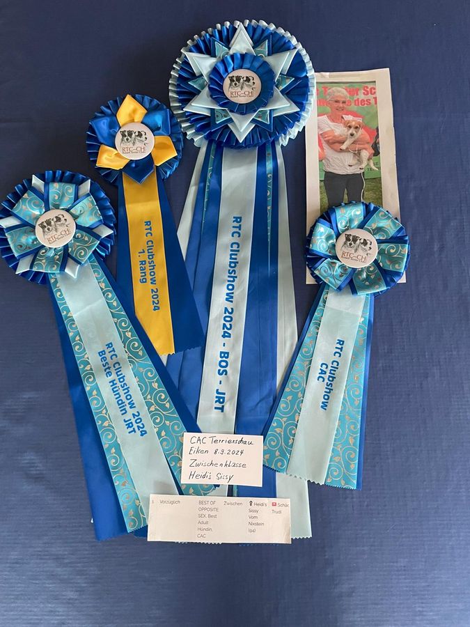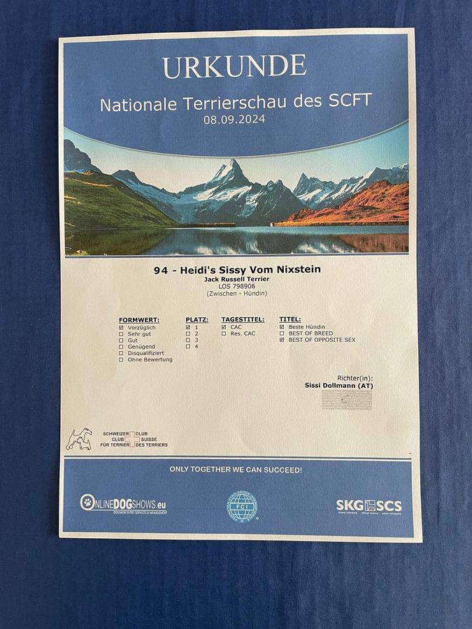 | 08.09.2024 | Terrierschau Eiken | Zwischen Klasse | Vorzüglich 1,CAC, Beste Hündin, Best of opposite Sex |
