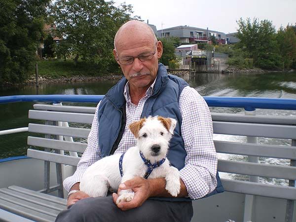 Er liebt seine Spaziergänge zum Hafen, dem Schiffsteg, die Seepromenade. Auch Ausflüge mit dem Boot (unser kleines) und dem Kursschiff hat er schon gemacht und sich über die vielen Wasservögel gefreut (da hat es eben mehr als nur die 5-6 in unserer Bucht - die er übrigens in Ruhe lässt, d.h. nicht anbellt). Zug- und Busfahren geht schon sehr gut, das mit dem Auto ist langsam am besser werden :)